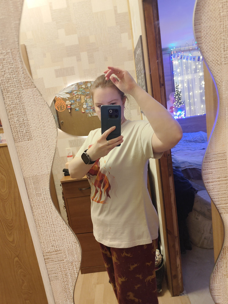 Женская новогодняя пижама с Лошадью — символом 2026 года сочетает уют, стиль и праздничное настроение. Модель выполнена из мягкого трикотажа 100% хлопок плотностью 160 г/м², который дышит, приятно ощущается на коже и не вызывает раздражений, поэтому подходит для ежедневного отдыха и сна. Верх комплекта — свободная однотонная футболка с ярким принтом Лошади. Современная графика подчёркивает новогоднюю тематику, а спущенный рукав и круглая горловина с аккуратной окантовкой делают посадку комфортной и расслабленной. Футболка не стесняет движений и легко садится по фигуре благодаря свободному силуэту. Штаны выполнены из трикотажа с набивным рисунком лошадей, который создаёт выразительный праздничный образ. Фасон — широкий, свободный, идеально подходящий для сна и домашних дел. В боковых швах находятся удобные карманы, добавляющие практичности. Особое внимание привлекает широкий простроченный пояс, мягко фиксирующий посадку и не вызывающий дискомфорта. Пижама прекрасно подходит для уютных семейных вечеров, подарков и новогодних фотосессий. Она является частью коллекции Family Look, что позволяет собрать гармоничный комплект для всей семьи в едином стиле. Мягкая, лёгкая и праздничная, эта пижама подарит комфорт и создаст настроение зимнего уюта.